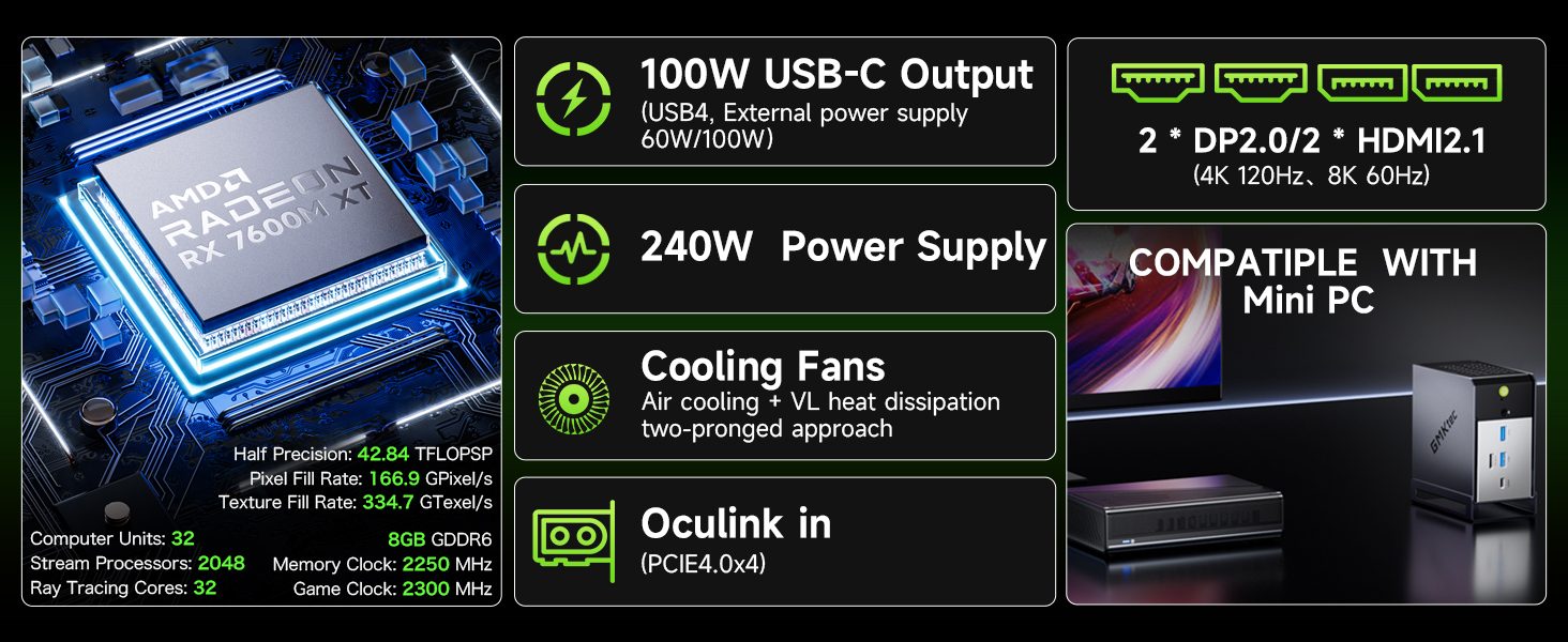 | Compatibility | Mini PCs, laptops, handheld consoles, and gaming consoles with Oculink or USB4 support |
